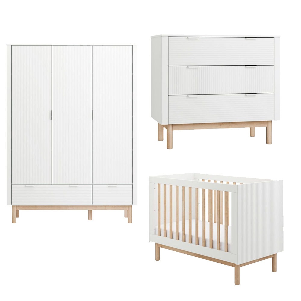 Ontdek de veelzijdige Pinio Miloo doorgroei babykamer Wit 3-deurs. De royale 3-deurskledingkast biedt voldoende opbergruimte met soft-close deuren. De praktische commode, met zijn handige laden en subtiele beuken poten, voegt een vleugje verfijning toe aan elke kamer. Het ledikant van 60x120 cm, met zijn aanpasbare bodem en de mogelijkheid tot ombouw tot bedbank, biedt een duurzame en flexibele slaapoplossing voor je kleintje.