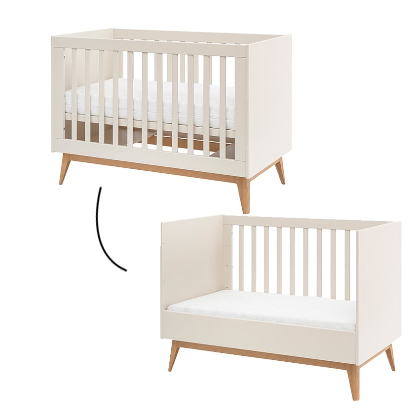 - Ledikant 60×120 cm: voorzien van een in hoogte verstelbare bedbodem en uitneembare spijlen, zodat je kindje zelfstandig in en uit bed kan stappen