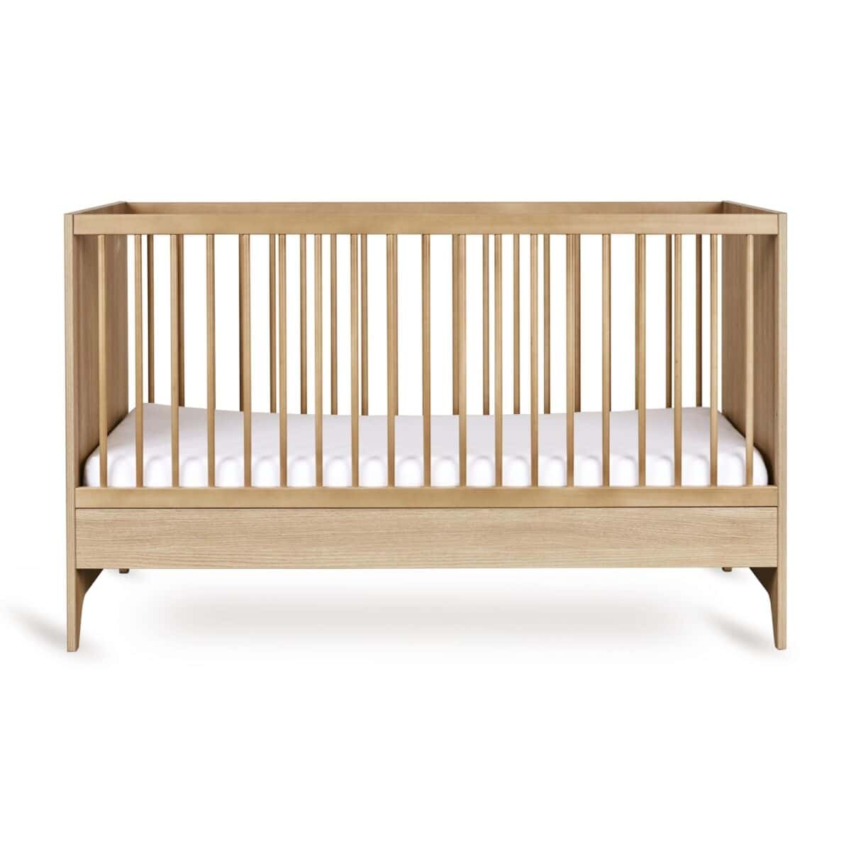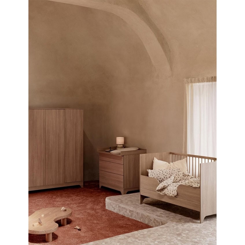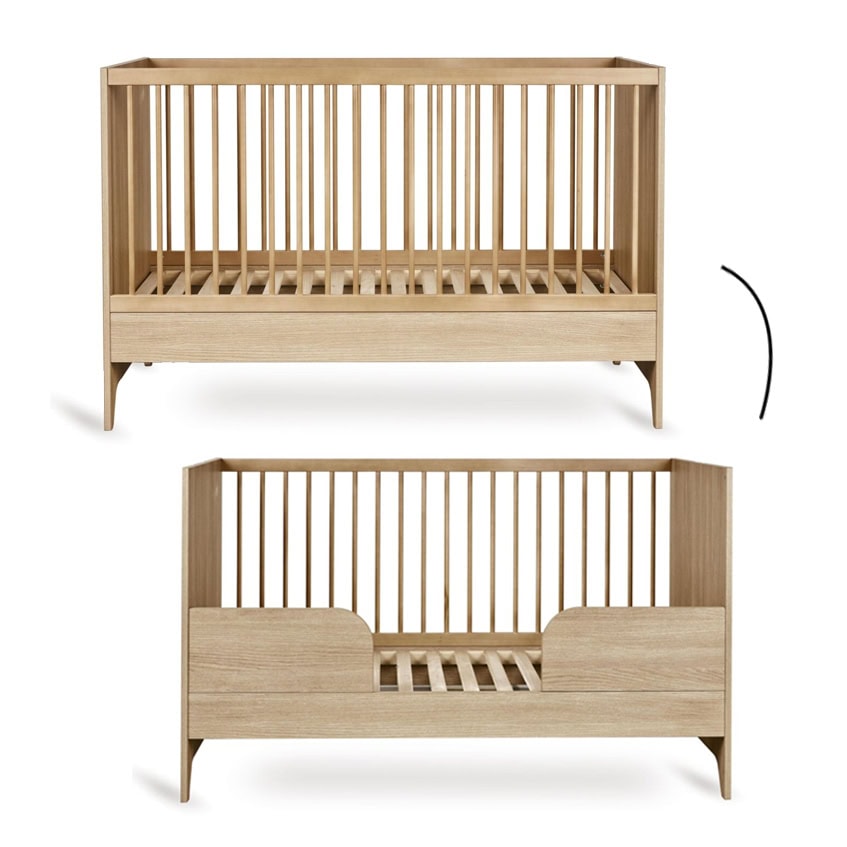 Dankzij de verstelbare bedbodem met drie hoogtes geniet je vanaf dag één van optimaal gebruiksgemak. De hogere stand is ideaal voor pasgeborenen, terwijl de lagere standen extra veiligheid bieden zodra je kindje beweeglijker wordt. Wanneer je kleintje toe is aan meer zelfstandigheid, transformeert het bed eenvoudig tot een half-open peuterbedje. Je vervangt dan één van de spijlenzijden door de meegeleverde uitvalbeschermer – een veilige én stijlvolle oplossing die perfect aansluit bij het ontwerp.Tijdloos design voor elke kinderkamer